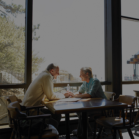 Older couple sitting at table in restaurant.